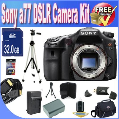 Kit Includes!1-Sony A77 24.3 MP Digital SLR with Translucent Mirror Technology - Body Only w/All Supplied Accessories1- 32GB SDHC Memory Card (Don't Miss a Memory!)1- Extended Life Battery (Great For Vacation!) 1- Ac/Dc Rapid Charger (Great For Vacation!) 1- USB SDHC Memory Card Reader (Download Images Quicker!)1- Deluxe Case W/Strap (Protect Your Camera!)1- Memory Card Wallet (Protect Your Photos!)1- Pack of LCD Screen Protectors (Protect from Dust And Scratches!)1- Lens/LCD Cleaning Kit1- Mini Table Size Tripod1- Mini HDMI to HDMI Cable1- Professional Full Size Tripod More About This Camera!Sony ? (alpha) SLT-A77V Body Only Digital SLR. World's fastest shooting DSLR. Get action photos, HD Movies and Live View shots that other cameras miss, thanks to Sony's exclusive Translucent Mirror Technology. Enjoy 24.3 megapixel resolution - with the world's fastest shooting - up to 12 frames per second - and the world's first OLED electronic viewfinder.