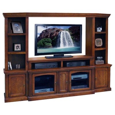 OS1208.SPR / OS3300.SPR Features: -Clean transitional style and shaped moldings.-TV stand features two large wood framed glass doors with an adjustable glass shelf behind each center wood door.-TV stand has two open compartments.-Bridge fits over the top and holds everything securely.-Made in USA. Includes: -Entertainment center includes two tier TV stand, left angled pier, right angled pier and cap bridge. Construction: -Constructed of maple solids and maple veneers. Color/Finish: -Spiced rum finish. Collection: -Old Savannah collection.