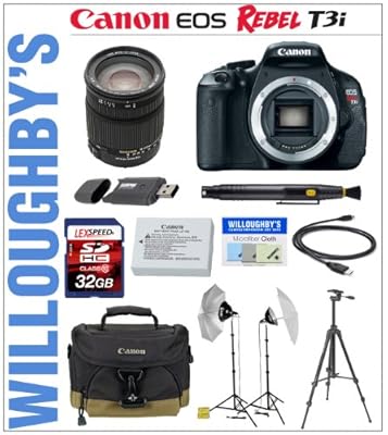 The General Zoom Bundle Includes:1. Canon EOS Rebel T3i Digital SLR Camera Body. 2. Canon 100EG Gadget Bag. 3. Canon LP-E8 Spare Battery. 4. Sigma 18-250mm F/3.5-6.3 DC OS HSM IF Lens. 5. LEXSpeed 32GB SDHC Class 10 Memory Card. 6. Smith-victor KT500U Professional Lighting Kit With Umbrellas. 7. Belkin 6' HDMI Cable. 8. Professional 72mm Multi-Coated 3pc Essential Filter Kit. 9. Sunpak SDHC USB 2.0 Card Reader. 10. Sunpak 5pc Digital Camera Cleaning Kit + Mini Tripod. 11. Sunpak 6600DX Digital Full Size Tripod. 12. LCD Screen Protectors. 13. Lens Pen Cleaning System.14. Professional Lens Cap Holder. 15. Memory Card Wallet. 16. Konica Minolta Inkjet Photo Paper 10 Sheets 8.5x11 Sample Pack. 17. Willoughby's Exclusive Micro Fiber Cleaning Cloth.Manufacturer Supplied: * Wide Strap EW-100DBIII * USB Interface Cable IFC-130U * AV Cable AVC-DC400ST * Battery Pack LP-E8 * Battery Charger LC-E8E * EOS Digital Solution Disc and Instruction Manuals * "Great Photography is Easy" Booklet and "Do More with Macro" Booklet