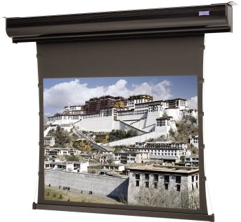 Best1 Tensioned Contour with Da-Mat fabric and 110 volt motor. . Electric Screen that Mounts on Wall or Ceiling. Screen is tensioned for an extra flat surface for optimum image quality. Tab guide cable system maintains even lateral tension to hold surface flat while custom slat bar with added weight maintains vertical tension. . Stylish curved aluminum extruded case. Adjustable mounting brackets make installation quick and easy. Built-in SCB-100 (RS-232 control), low voltage control or video projector interface are available options. . Da-Mat is a screen surface with a smooth, white, vinyl finish for precise image reproduction that provides an exceptionally wide viewing angle with no resolution loss. It is a highly flexible fabric that may be folded or rolled. Its versatility makes it a great choice for situations with good control over ambient light and where an exceptionally wide viewing angle is necessary. 1.0 Gain with a 50-degree viewing half angle. . review