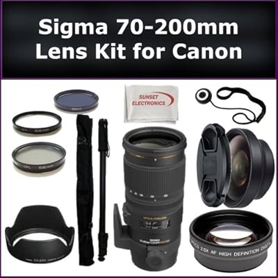 This Ultimate Sigma 70-200mm f/2.8 EX DG APO OS HSM Lens + Accessory Kitfor Canon Includes:- Sigma 70-200mm f/2.8 EX DG APO OS HSM Lens- 0.45X Wide Angle Lens- 2X Telephoto Lens- Lens Cap- Lens Hood- Lens Cap Keeper- Monopod- 3 Piece Filter Kit (UV, FLD, CPL)- Microfiber Cleaning Cloth