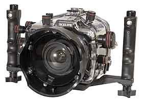 The heavy duty thick wall dSLR housing is molded of corrosion free clear polycarbonate, features full capabilities, and operates safely to 200 feet.The housing includes iTTL conversion circuitry that provides four 1/3 f/stop increments over or under flash compensation that is added to or subtracted from any compensation entered into the camera, or seven manual power settings in halfstop increments. All choices are obtained by simply rotating a knob on the housing back.The housing's special conversion circuitry operates perfectly with all current model Ikelite DS digital SubStrobes. See strobe requirements by serial number.Other strobes can be used, but they can not provide iTTL. Mount and sync cords for Nikonos and sync cords for Inon or Sea Sea strobes are available.All ports from our SLR systems can be utilized, allowing use of most macro, wide angle, and zoom lenses. This system allows you to see that the port is sealed.The housing "O" ring seal is a masterpiece in failsafe simplicity compared to designs that require stuffing the "O" ring into a groove. You can see that the "O" ring is sealed.The Release Handles allow easy attachment and removal of SubStrobe mounting arms at the touch of a button. Two screws remove the handle and tray assembly for traveling. Controls for all camera functions are provided except lock switch and the function button.AE/AF lock button can be activated with your thumb while holding the handle. The AF "on" is controlled by push button.Camera Flash Compensation button can be activated by your index finger while your hand remains on the handle. A control for Lens Release is also included.Focusmode (C/S/M) selector can be changed with a little finesse.The camera tray is notched, allowing battery and card replacement without removing the camera from the tray.The housing size and weight provides neutral buoyancy and superb handling underwater. Camera installation is quick and simple.