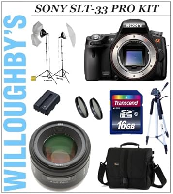 Get the Sony SLT-A33 Digital SLR Camera with the Willoughby's Portrait Pro Series Package and take photos like the pros. Featuring the Sony SAL 50mm f/1.4 (SAL-50F14) Lens makes it ideal for professional close-up photography. The Kit includes: 1. Sony SLT-A33 Digital SLR Camera. 2. Sony SAL 50mm f/1.4 (SAL-50F14) Lens. 3. 5 Piece Camera Cleaning Kit with mini tripod. 4. 67" Pro series camcorder tripod with a tripod carrying case . 5. A Professional Smith-victor KT500U lighting kit with umbrellas. 6. Lowepro camera bag. 7. Transcend 16GB SDHC memory card. 8. REPLACEMENT (NP-FW50) BATTERY 9. 55mm Circular Polarizing Lens Filter. 10. 55mm Ultra Violet Lens Filter. 11. Sony Kids In Focus Instructional DVD for Alpha DSLRS, with exclusive tips from world-renowned photographer, Me Ra Koh. What's In the Box From Sony Sony SLT-A33 Digital SLR Camera * Battery Charger (BC-VW1) * Body Cap * Rechargable Battery (NP-FW50) * USB Cable * Shoulder Strap * CD-ROM