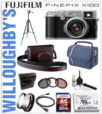 The FinePix X100 features a beautiful, high-quality design inspired by the classic look and feel of traditional film cameras. The top cover of the upper control deck and the bottom surface have been die-cast from magnesium alloy (semi-solid metal casting), contributing to a high-precision camera body. All dials and rings are precision milled from metal. The ergonomics of the design offer the perfect balance between compact convenience and user-friendly functionality. The chassis has been finished with high-quality leather-like accents and is both a delight to use and a pleasure to hold. The Willoughby's Bundle Includes: 1. FujiFilm FinePix X100 Digital Camera with Sharp, Fixed 23mm F2 Single Focal Lens (Equivalent to 35mm/135 Format). 2. Fuji LC-X100 Custom Leather Case. 3. Lens Hood - Includes Adapter Ring 4. Fuji NP-95 Spare Battery. 5. DSLR Camera Bag. 6. Pro Series Multi-Coated 3PC Filter Kit 7. 6' HDMI Cable. 8. Heavy Duty Tripod. 9. USB 2.0 Card Reader. 10. Giottos Pro Camera Cleaning Kit with Small Rocket Air Blower. 11. LexSpeed 32GB SDHC Class 10 Memory Card. 12. LCD Screen Protectors. 13. Professional Lens Cap Holder. 14. Memory Card Wallet. 15. Inkjet Photo Paper 10 Sheets 8.5x11 Sample Pack. 16. Willoughby's Micro Fiber Cleaning Cloth. Manufacturer Supplied: Fujifilm FinePix X100 Digital Camera. Li-ion Battery (NP-95). Battery Charger (BC-65N). Shoulder Strap. USB Cable. Lens Cap. Metal Strap Clip. Protective Cover. Clip Attaching Tool. CD-ROM. Owner's Manual. 1-Year Limited Warranty.
