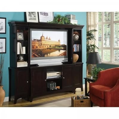 This TV entertainment center includes a flat screen TV stand and two curio pier cabinets with recessed lighting on the open tempered glass shelves, and cabinets with doors underneath for extensive media storage. A bridge is included to reach across the piers, finishing the piece perfectly. The television area is perfect for most large flat screen TVs, measuring 52"W x 35"H. This entertainment furniture is made of solid rubberwood with veneers. Rubberwood is an eco-friendly choice for home furnishings, plantation grown and having already served a useful function prior to being used for furniture. Assembly level/degree of difficulty: Easy.